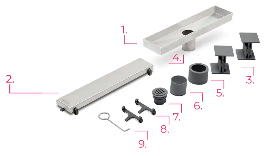 - Desagüe lineal fabricado en acero inoxidable AISI 304.