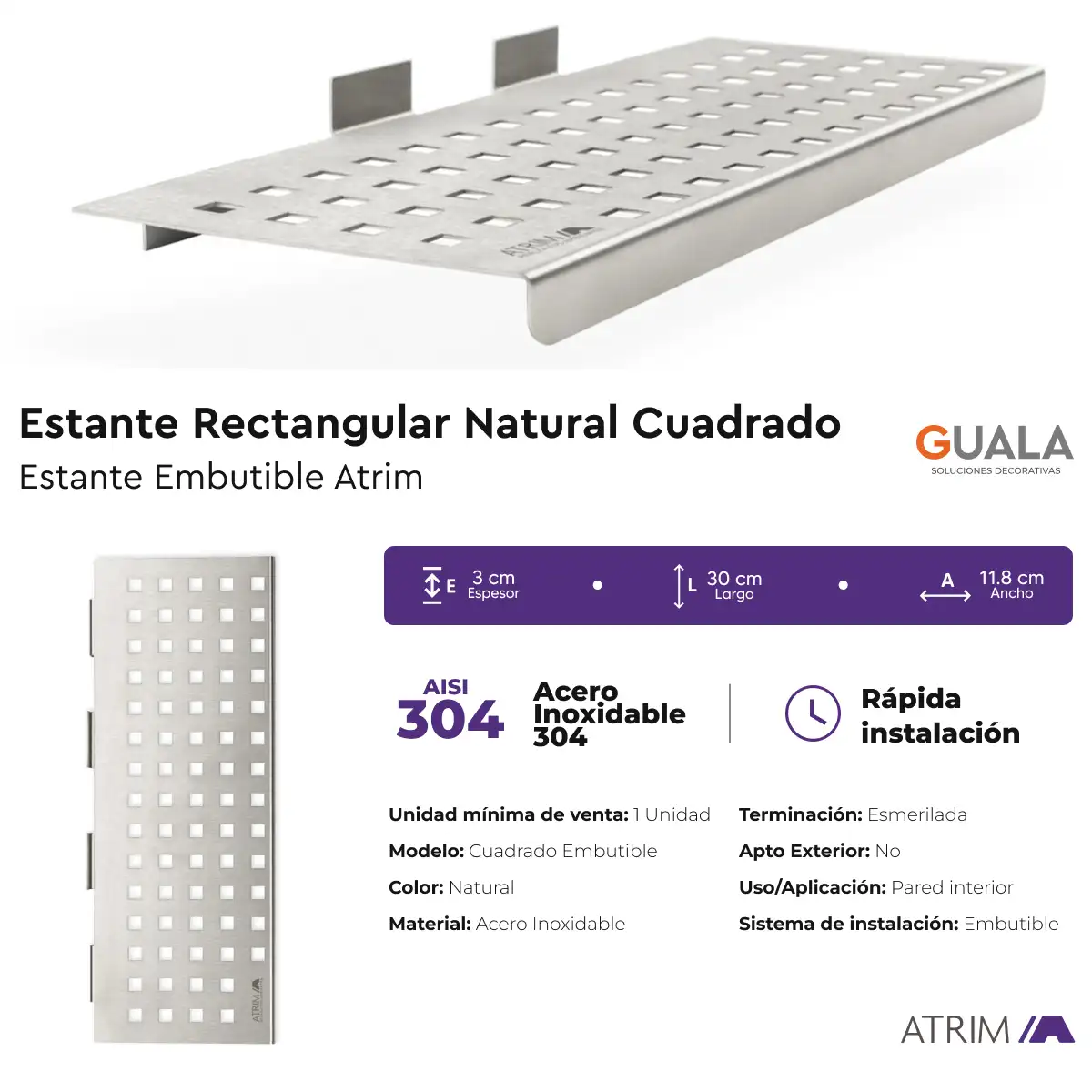 Estante Rectangular Cuadrado Atrim Embutible Esmerilado 30 cm