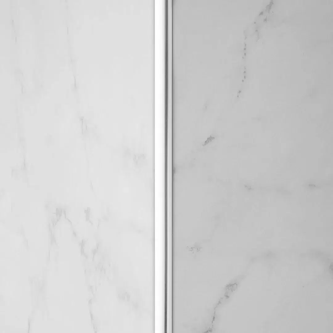 Su diseño resuelve el encuentro de paredes, columnas y ventanas. Puede utilizarse cómo terminación cuando el revestimiento no llega al cielorraso. Acompaña griferías y diseños curvos.