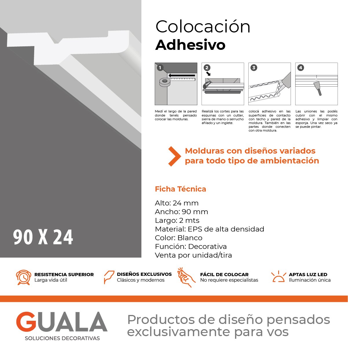 Se coloca con adhesivo para molduras o enduído. Recomendamos cortar las esquinas de empalme con un inglete para molduras y una sierra o cutter.