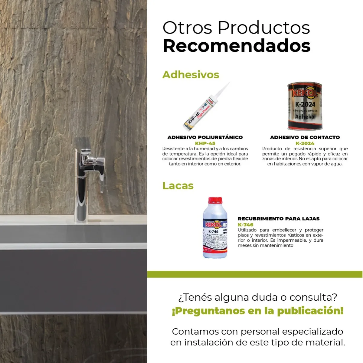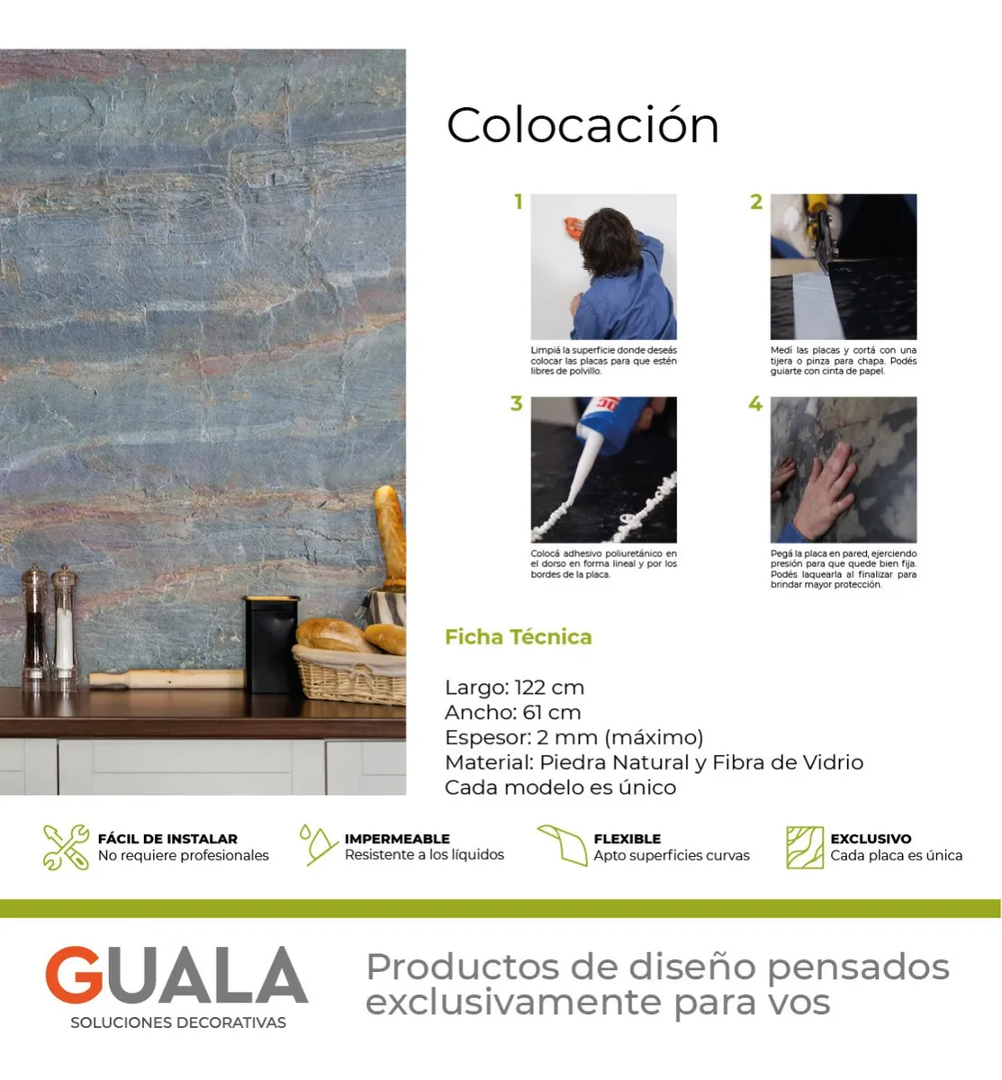 Es un revestimiento de PIEDRA REAL natural flexible. La combinación perfecta entre naturaleza y tecnología resulta en este material único que tiene la belleza y resistencia de la piedra en una lámina cubierta por una base de fibra de vidrio y resina poliéster que le dan flexibilidad, además de fuerza, al mismo tiempo que se mantiene súper liviano.