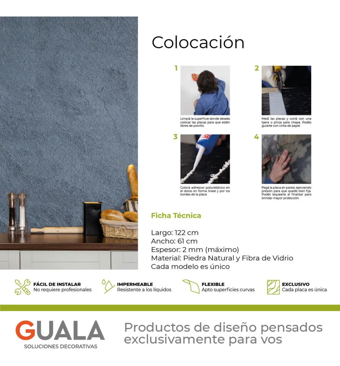 Es un revestimiento de PIEDRA REAL natural flexible. La combinación perfecta entre naturaleza y tecnología resulta en este material único que tiene la belleza y resistencia de la piedra en una lámina cubierta por una base de fibra de vidrio y resina poliéster que le dan flexibilidad, además de fuerza, al mismo tiempo que se mantiene súper liviano.