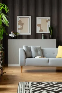 Terminación 1 del Revestimiento Wall Panel Tulum acanalado para interiores. Fabricados en EPS, revestidos con una lámina en tonos símil madera.