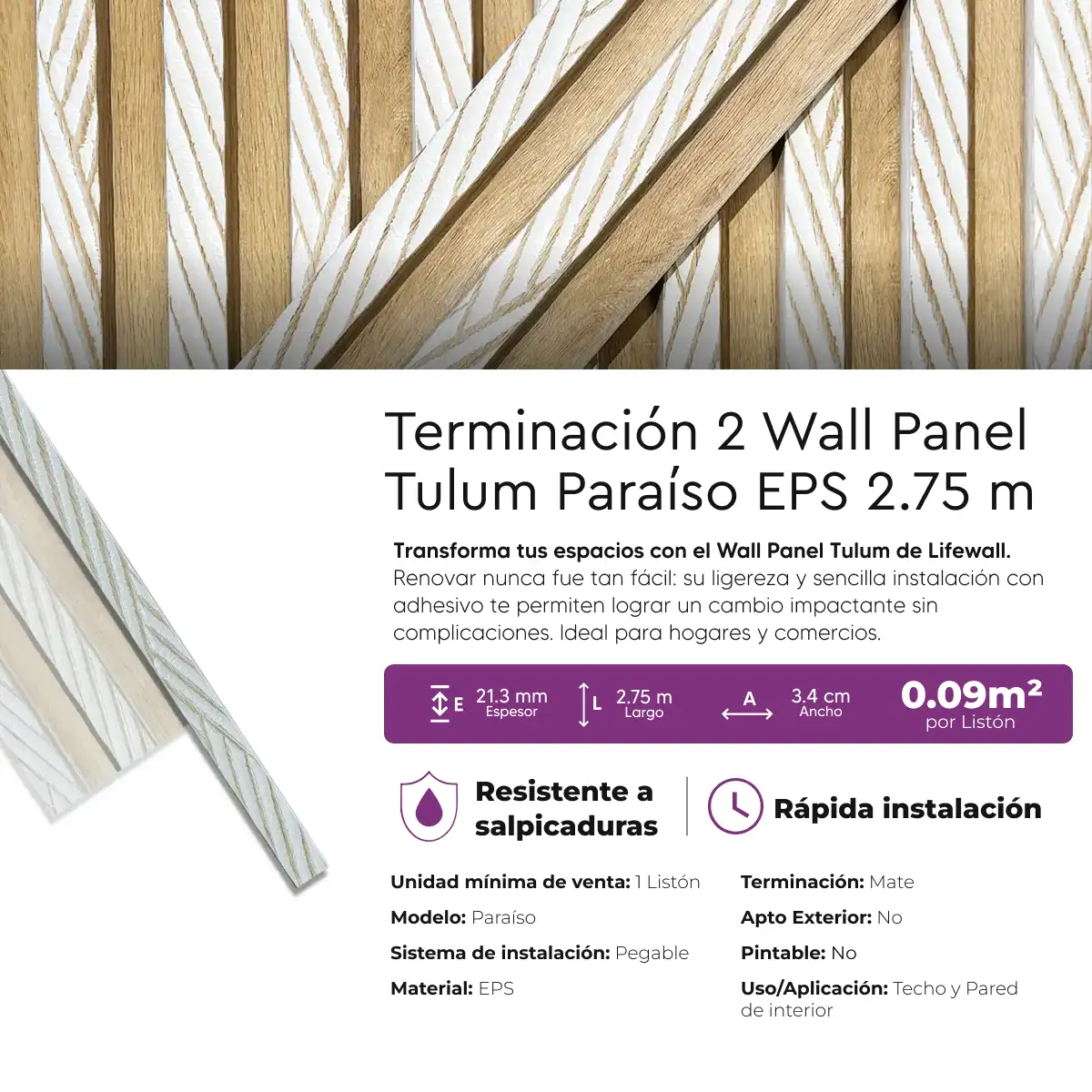 Terminaciones de EPS de la línea Tulum de Lifewall. Su ligereza brinda una sencilla instalación con adhesivos multiusos, ofreciéndote un cambio impactante sin complicaciones. Ideal para hogares y comercios.