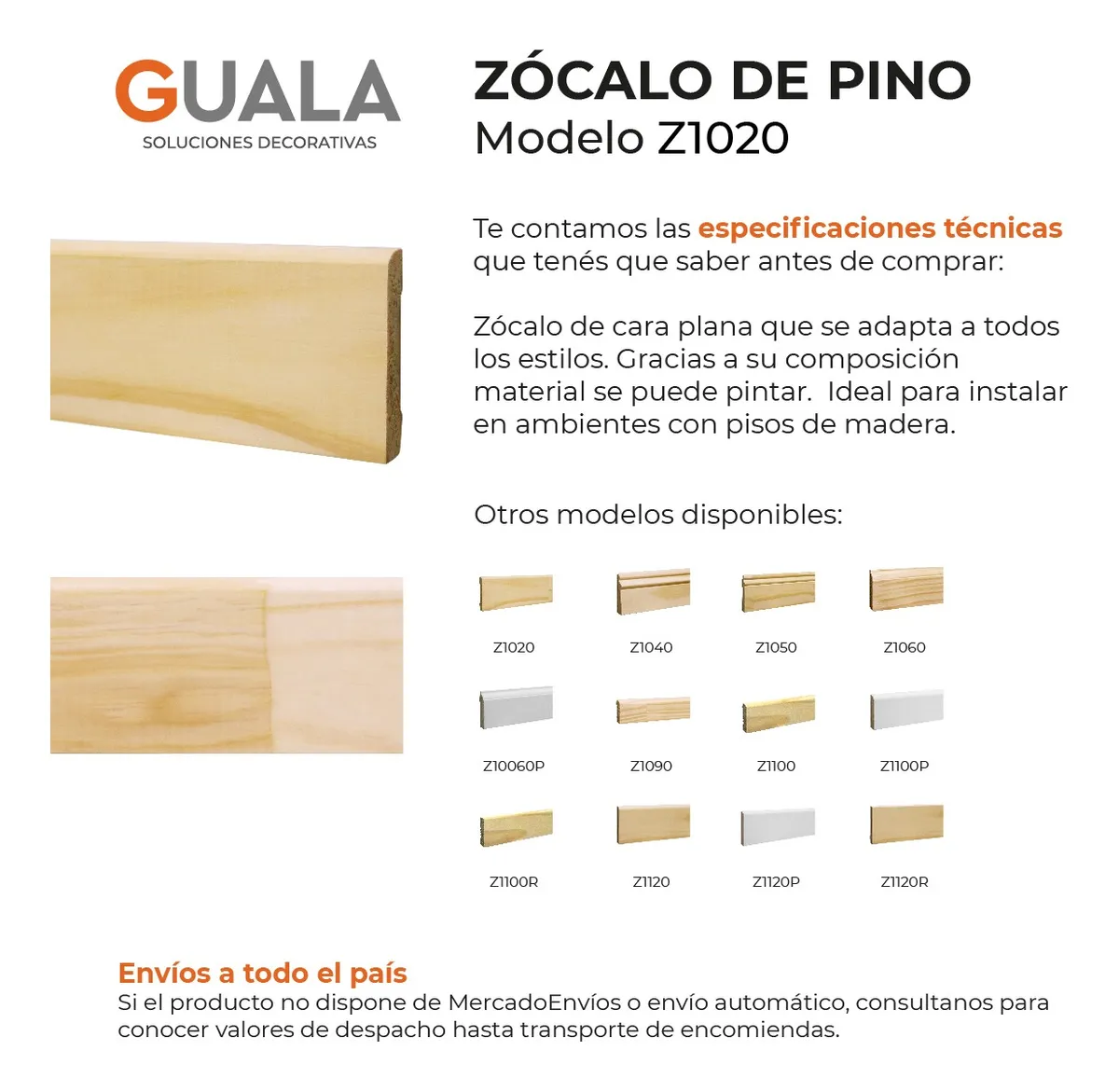 Zócalo de pino natural, de cara plana y terminación curva, que se adapta a todos los estilos.