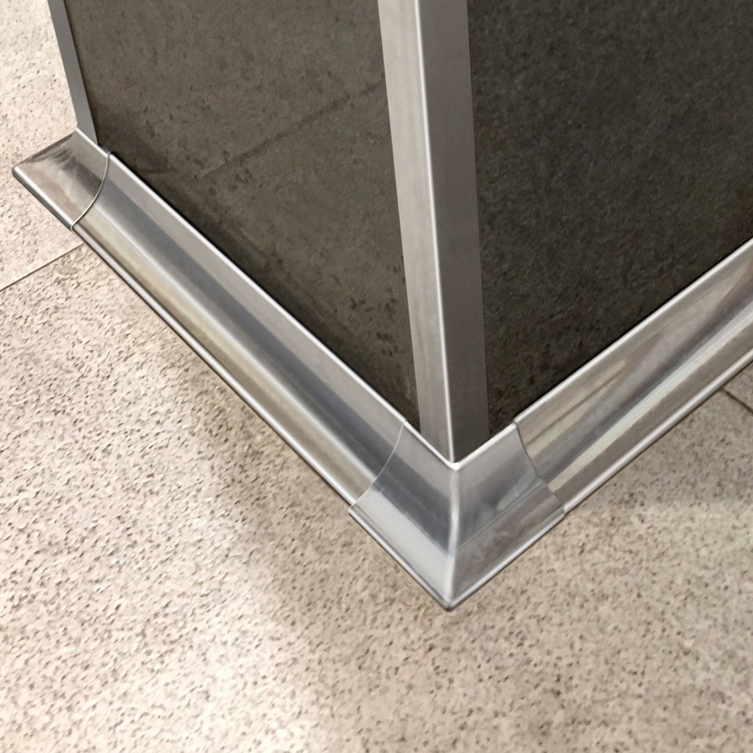 Zócalo Sanitario Plus de acero inoxidable y acabado brillante. Su forma de media caña cóncava sella completamente las uniones, evitando bacterias, filtraciones y suciedad.